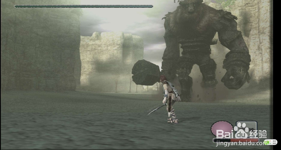 巨像獸王,場地內(nèi)有一排一排的矮墻,巨像會踢碎它們。翻越這些矮墻來到場地另一端一排柱子底下,吹哨吸引巨像低頭找你,跳到它胡子上。從胡子到胸毛,再到后背,弱點(diǎn)在頭頂,血流一半后弱點(diǎn)轉(zhuǎn)移到左腎部位。