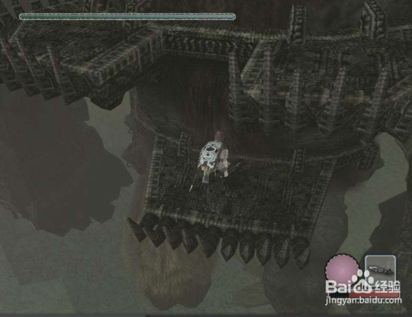 巨像牛頭怪,跳到巨像小腿肚子上,刺弱點(diǎn),巨像下跪。從小腿肚子跳到大腿護(hù)甲上,再從大腿護(hù)甲一口氣爬到腰部小平臺上。爬到頭頂弱點(diǎn),等巨像不動時,按一下攻擊蓄力,觀察右下角耐力槽,一個光圈從中心向外擴(kuò)散,光圈越大刺入力量也越大,再按一下攻擊刺入。