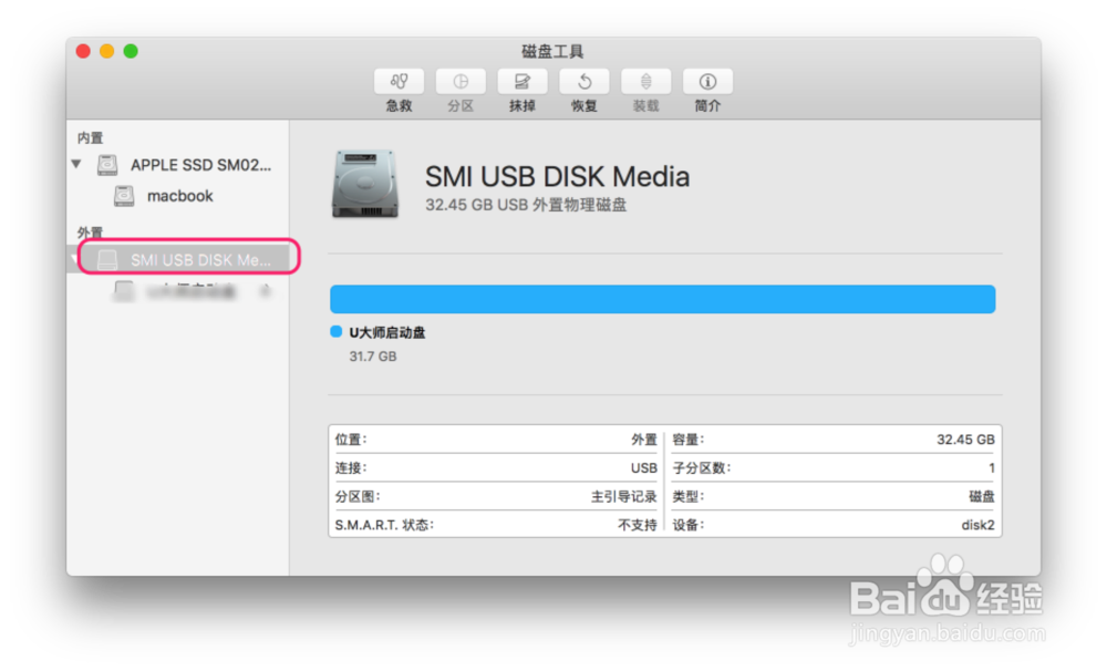 把U盤插入Mac并注意備份資料,打開磁盤工具。