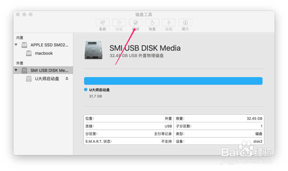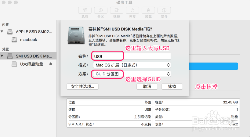 然后點擊U盤,點擊抹掉,輸入名字大寫USB,然后選擇guide模式,最后點擊抹掉即可。