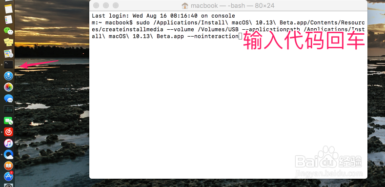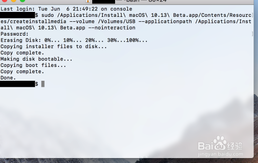 打開終端然后粘貼如下的代碼:sudo /Applications/Install\ macOS\ 10.13\ Beta.app/Contents/Resources/createinstallmedia --volume /Volumes/USB --applicationpath /Applications/Install\ macOS\ 10.13\ Beta.app --nointeraction