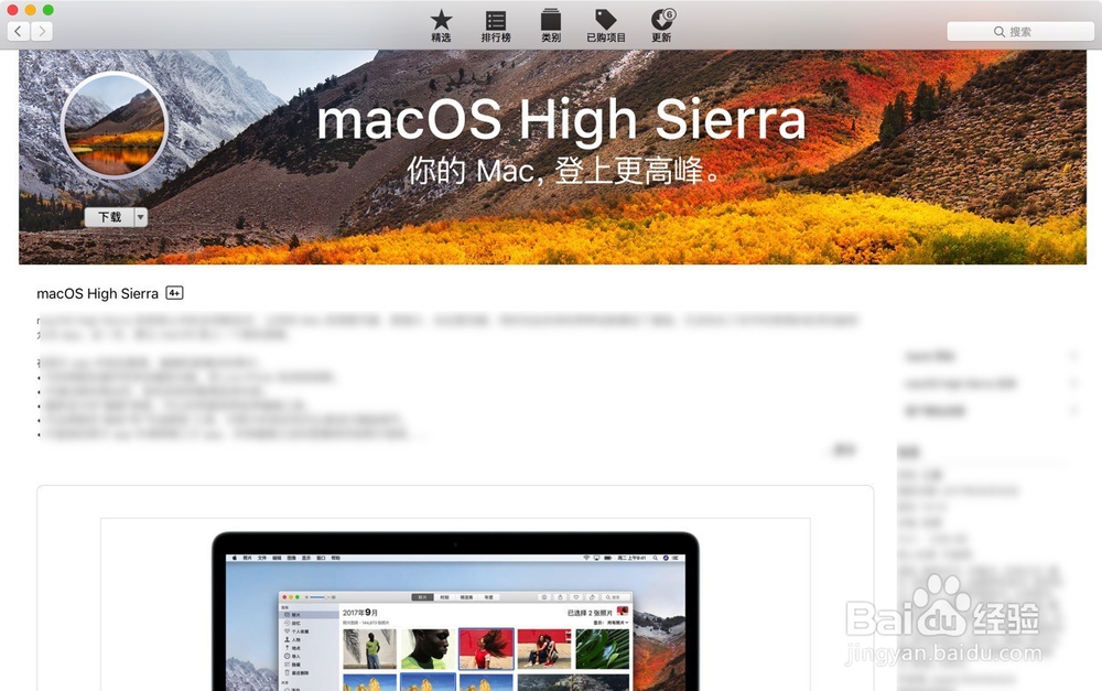 或者直接點擊圖片中的macOS High Sierra,因為已經(jīng)是正式版了所以商店里面已經(jīng)有了首頁推薦,然后點選下載就可以了。