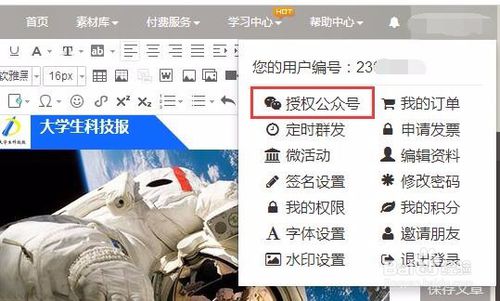 同步到微信平臺。首先要授權(quán)公眾號給135,有兩個地方可以授權(quán),看圖