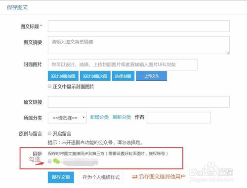 授權(quán)成功后,在“保存文章”的時候就可以勾選同步的公眾號了,這樣文章就會同時保存在微信公眾平臺的“素材管理”中了