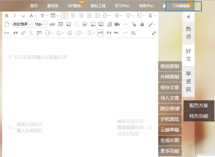 135編輯器提供非常好用的圖文化的微信編輯器??梢噪S心所欲的變換顏色調(diào)整格式,更有神奇的自動配色方案。