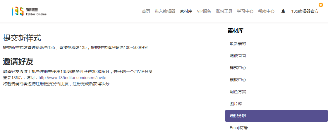 素材庫包括:最新素材、隨便看看、樣式中心、模板中心、配色方案、圖片庫、賺積分啦、Emoji符號等。