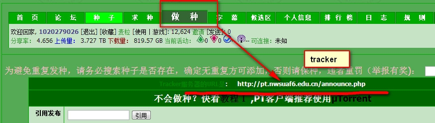 然后再tracker屬性填寫PT站的tracker,每一個PT站tracker都不一樣.現(xiàn)在,本人以MTPT為例。查詢tracker可以到站內(nèi)點擊【發(fā)布】,有的站是【做種】就可以看到了。如圖: