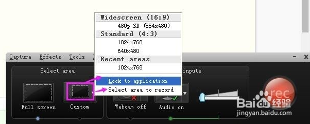 另外一種是Custom(自定義模式),由用戶自己確定錄制區(qū)域,可以定義為Lock to application(鎖定當(dāng)前應(yīng)用程序窗口),也可以定義為Select area to record(選擇區(qū)域去錄制);