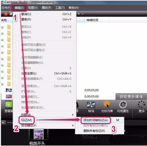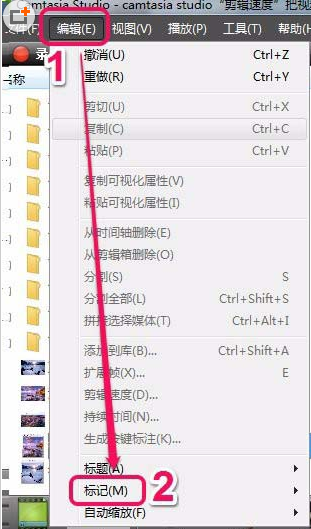9、還是打開“編輯”菜單,選擇“標(biāo)記”中的“添加時間軸標(biāo)記”命令。
