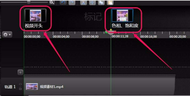 (2)鼠標(biāo)移動至?xí)r間軸上方一點點的位置,出現(xiàn)綠色豎線。假如我們要截取10秒~40秒的部分,那么在10秒上方點擊一下,出現(xiàn)“標(biāo)記1”。
