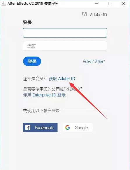出現(xiàn)登錄選框的時候,點擊下方箭頭所指的獲取Adobe ID。(如果你安裝沒有出現(xiàn)這個,可以直接進行下一步) 如圖三。