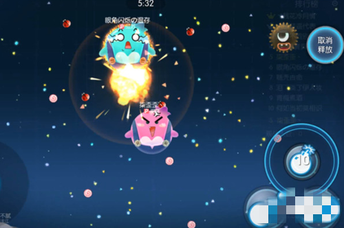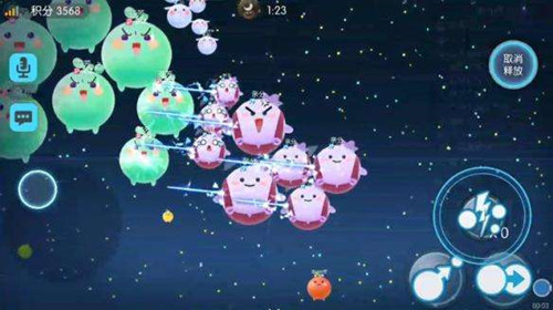 5.射擊技能在歡樂(lè)球吃球中是比較好用的一個(gè)技能,通過(guò)設(shè)計(jì)技能削弱對(duì)方的大小。例如,在游戲中你的精靈(包括分身)射出一枚子彈,被擊中的目標(biāo)會(huì)強(qiáng)制掉落2個(gè)孢子,消耗你7個(gè)積分,只有短短的0.5秒CD。要按下射擊圖標(biāo)后會(huì)出現(xiàn)彈道指示器,轉(zhuǎn)動(dòng)技能改變彈道瞄準(zhǔn)方向,松手即可完成射擊指令,手指往上移動(dòng)到【取消釋放】區(qū)域則可取消釋放技能。這樣可以看出射擊是一個(gè)冷卻時(shí)間非常短的消耗技能,在遇見(jiàn)體重差不多大的對(duì)手時(shí),先用射擊將對(duì)手體重減小,然后再吃掉對(duì)手身上的孢子,慢慢將對(duì)手蠶食掉。