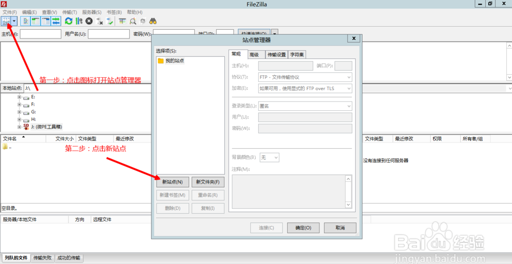 設(shè)置軟件:首先,按照下圖的提示,打開站點管理器;然后,點擊新站點;