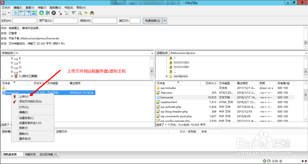連接成功后,在左邊看到的就是您電腦上的文件,右邊就是空間上的文件,選中您要上傳的文件,然后右擊,選上傳(如果是上傳到空間上某個特定的文件夾,請先在右邊打開那個文件夾,再上傳)。