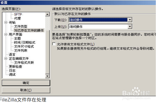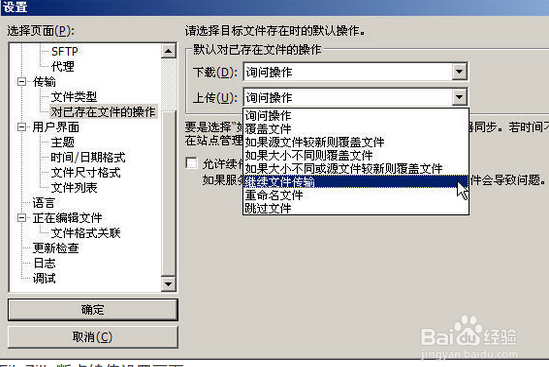斷點續(xù)傳功能可以說幾乎是每個FTP軟件必備的功能,也可以說是最基本和重要的功能了。它的實質(zhì)就是當(dāng)傳輸文件過程中,由于各種原因使得傳輸過程發(fā) 生異常,產(chǎn)生中斷,在系統(tǒng)恢復(fù)正常后,F(xiàn)TP軟件能夠在之前發(fā)生中斷的位置繼續(xù)傳輸文件,直到數(shù)據(jù)傳送完畢為止。通過菜單【編輯】—>【設(shè)置】的對 已存在文件的操作選項我們就可以設(shè)置斷點續(xù)傳。