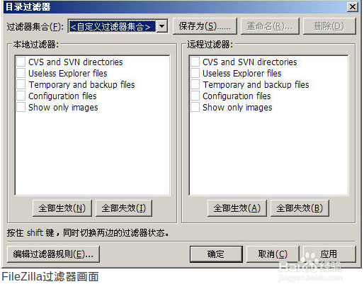 過濾器功能簡單的說就是將符合條件的待傳輸文件及目錄進行傳輸,我們可以通過設(shè)置擴展名、優(yōu)先級類表等來控制文件的傳輸。通過菜單【查看】—>【文件過濾器】我們就可以對傳輸?shù)奈募M行選擇。(但是感覺好像不起作用)