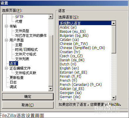 FileZilla3.0標準版支持包括中文簡體在內(nèi)的多語言界面。通過菜單【編輯】—>【設(shè)置】的語言選項,我們就可以設(shè)置使用的語言。