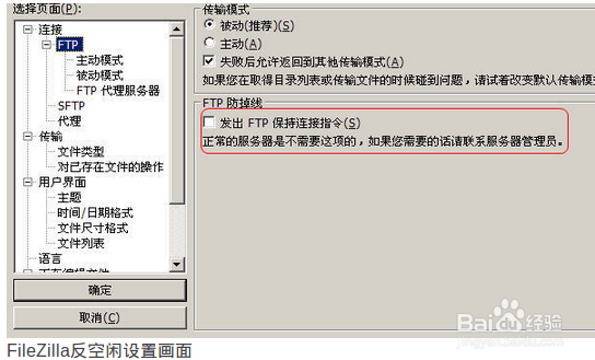 所謂防掉線或者說反空閑、閑置保護功能就是讓計算機在空閑狀態(tài)下每隔一段時間向FTP服務(wù)器發(fā)送一段特定信息,以便讓FTP服務(wù)器知道自己還是活動的,從而并且FTP服務(wù)器斷開對自己的連接。通過菜單【編輯】—>【設(shè)置】的FTP選項,我們就可以設(shè)置相關(guān)的參數(shù)