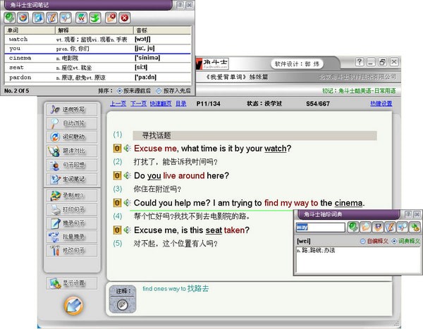 - 1,600多句時尚超酷情景美語(美籍外教錄音)我公司聘請美籍外教精心編輯的口語教材,全面、時新、地道,包含一些其他口語教材一般沒有的 Internet、電信等話題,涵蓋了工作生活的各個方面,包括飲食、起居、購物、交通、求職、住宿、教育、娛樂、體育、旅游、因特網(wǎng)、態(tài)度、心情等100多個生活中的分類情景。另外與眾不同的是,本軟件特別精編了200多句典型語法例句,背熟這些句子就等于掌握了語法,再也不會犯中國人說英語常見的時態(tài)、單復(fù)數(shù)、虛擬語氣等方面的錯誤了!