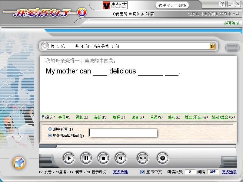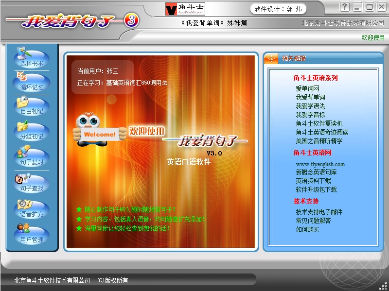 《我愛背句子3》提供主要的句子學(xué)習(xí)功能、MP3制作功能以及句庫擴(kuò)充功能。