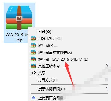 1.鼠標(biāo)右擊軟件安裝包,選擇解壓到CAD2019。