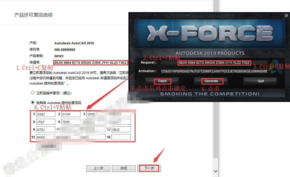 16.把申請?zhí)枏?fù)制到注冊機(jī)里面的Request中(記得刪除原Request中的內(nèi)容),先點(diǎn)擊Patch,再點(diǎn)擊Generate后復(fù)制Activeation中生成的激活碼,然后粘貼激活碼至我具有Autodesk提供的激活碼方框中。最后點(diǎn)擊下一步即可。