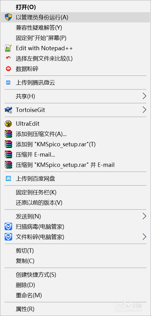 在本站下載KMSpico激活軟件,下載完成后右鍵選擇“以管理員身份運(yùn)行”,如下圖所示菜單頁。