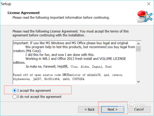 進(jìn)入“License Agreement”對話框中,選擇“I accept the agreement”,然后點(diǎn)擊“Next”。