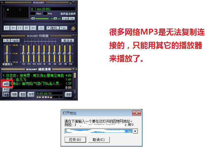 然后在Winamp播放清單那里點(diǎn)擊添加——網(wǎng)——然后把剛剛復(fù)制的MP3地址粘貼到打開地址輸入框那里——點(diǎn)擊打開,就可以打開網(wǎng)絡(luò)的MP3了。很多網(wǎng)絡(luò)MP3是無法復(fù)制連接的,只能用其它的播放器來播放了。
