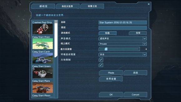 太空工程師中文版大部分時(shí)候您可能還是一個(gè)人或者只是和朋友玩耍的,所以我們著重看一下自定義世界,出了選擇不同的開局之外,您還可以選擇游戲的環(huán)境惡劣程度(隕石的傷害以及頻率大小)。