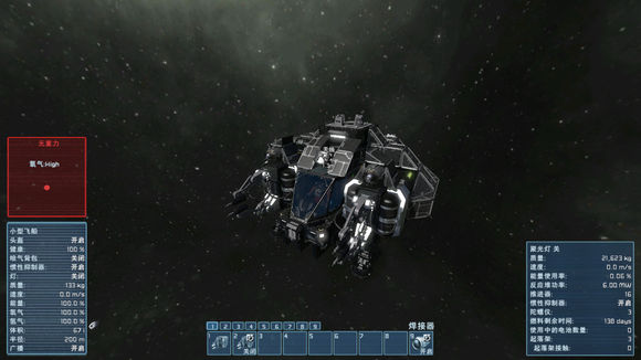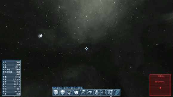 上圖所示是基本的界面:左側(cè)是玩家信息,中間是工具欄,玩家可以通過(guò)按鍵調(diào)出建造工具或者想要建造的方塊。右側(cè)則是環(huán)境中重力與氧氣的情況。