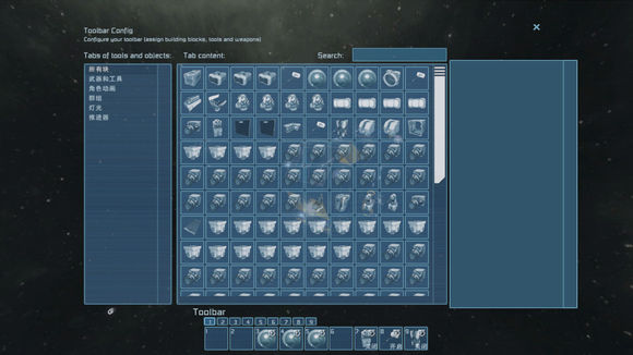 您在游戲中會(huì)經(jīng)常接觸G菜單與K菜單,當(dāng)您不在載具內(nèi)時(shí),按下“G”鍵會(huì)調(diào)出如上圖菜單,您需要將工具以及想要建造的方塊拖動(dòng)至下方快捷欄以使用。(注:游戲中有搜索功能,但是在打了漢化補(bǔ)丁之后搜索功能會(huì)失效)