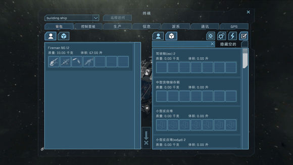 上圖是K菜單中的背包欄,左側(cè)是玩家的背包,右側(cè)是飛船/空間站中有存放功能的設(shè)施中的物品,如果設(shè)施眾多,您可以點(diǎn)擊右上角的各類篩選按鈕來(lái)縮小搜索范圍。把物品拖到中間底部的圖標(biāo)則可以將其扔掉。
