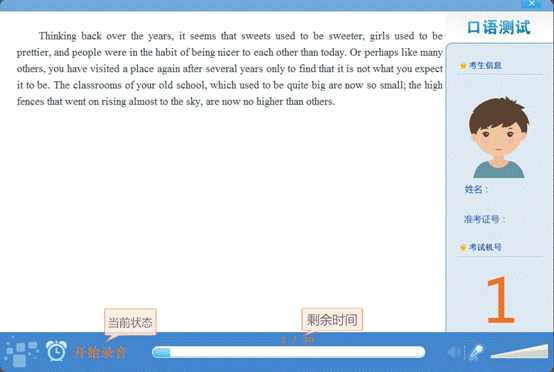 為確??荚嚹軌蛘_M(jìn)行,需進(jìn)行錄音設(shè)備及放音設(shè)備檢查。錄音鍵和播放鍵分別測試耳機(jī)和話筒的情況,可在右下角調(diào)節(jié)音量。