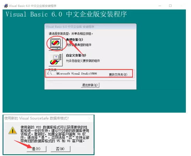 12.選擇典型安裝,默認安裝在C盤(建議安裝在除C盤以外的磁盤上,可在D盤或其它盤上新建文件夾VB6.0),點擊是。