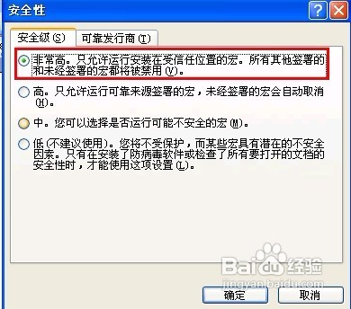 進入安全級選項卡界面,選擇“非常高。只允許運行安裝在受信任位置的宏。所有其他簽署的和為經簽署的宏都將被禁用?!?br />
