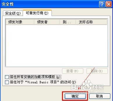 刪除所有對象,并將“信任所有安裝的加載項和模板”和“信任對于“Visual Basic項目”的訪問”的復選框去勾