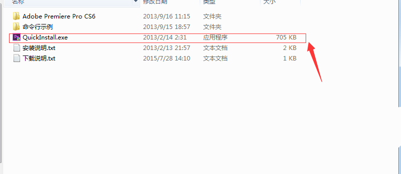 1.在本頁面下載premiere cs6中文版,下載完成后,會出現(xiàn)一個壓縮包,進行解壓到硬盤中,解壓到那個盤符,premiere cs6中文版就會安裝到那個盤符中,建議放到D、E磁盤中。2.解壓完成之后可以看到幾個文件和文件夾,有一個Pr圖標(biāo)的軟件,名字是“QuickInstall.exe”文件,如下圖,已經(jīng)用紅線和箭頭標(biāo)出: