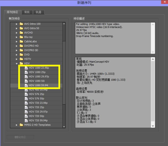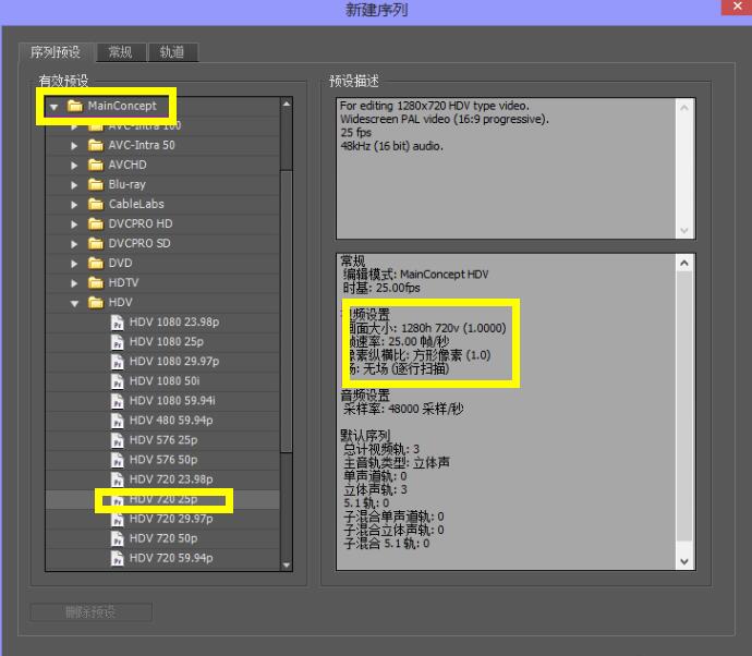 4、在彈出的序列中選擇HDV 720 25P的格式,然后制作出來的視頻尺寸就是1280x720