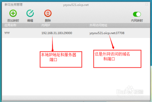 4.點(diǎn)擊確定,就轉(zhuǎn)發(fā)出去了,注意看圖片中的地址和端口,一定要弄清楚外網(wǎng)訪問要通過哪個(gè)端口,如圖: