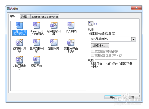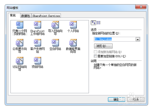 在“網(wǎng)站模板”對話框的“常規(guī)”選項卡中,選擇“只有一個網(wǎng)頁的網(wǎng)站”,并在“指定新網(wǎng)站的位置”下方的文本框輸入站點文件夾的路徑,如:“E:\kejiahun”。
