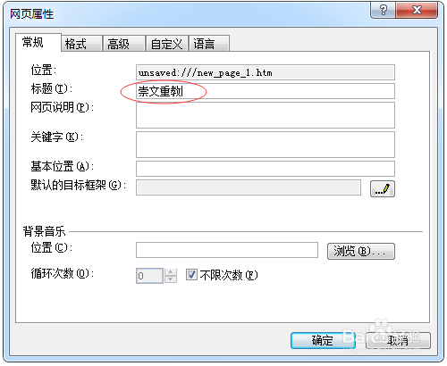 (2)在“網(wǎng)頁屬性”對話框的“常規(guī)”選項卡的“標(biāo)題”文本框中輸入網(wǎng)頁標(biāo)題,如圖。