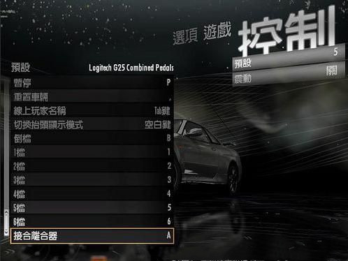2. 這時我們再退回到游戲設(shè)置選項,選擇 "控制",此時注意屏幕右側(cè)的設(shè)置方案,將 "預(yù)設(shè)1" 調(diào)換為 "預(yù)設(shè)5" 即"Logitech G25 Combined Pedals"方案,這個方案是專門為羅技"G25_C-Pedals"控制設(shè)備使用的配套方案,該方案中已將所有默認(rèn)鍵位及參數(shù)準(zhǔn)確同步于此設(shè)備,方便玩家直接使用.而這個方案中才有離合器及指定切擋功能,我們接下來要做的就是更改這套方案的默認(rèn)設(shè)置,把所有鍵位換為自己習(xí)慣的鍵位,通過套用這套方案,我們就可以實現(xiàn)自主離合器功能了.