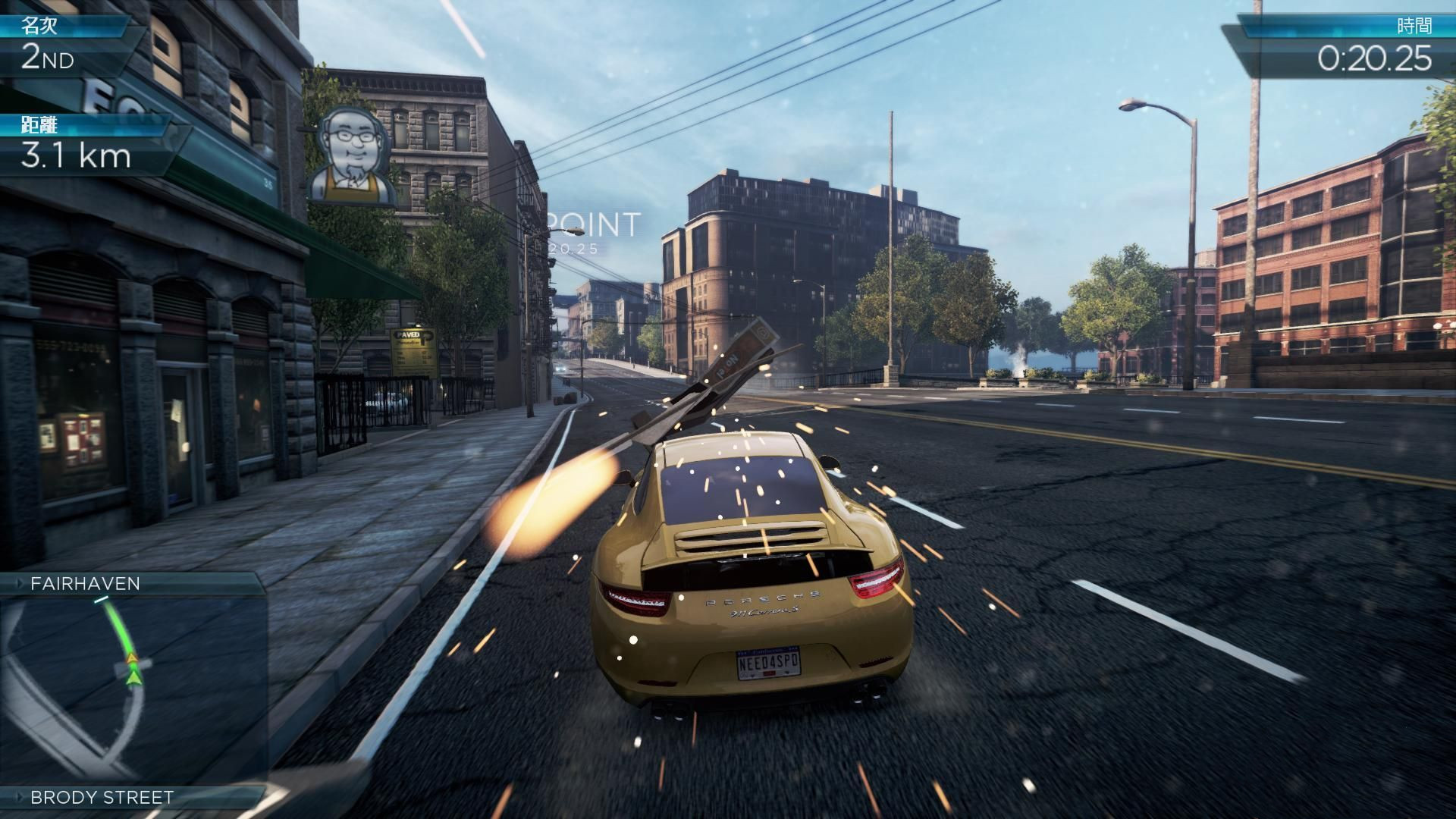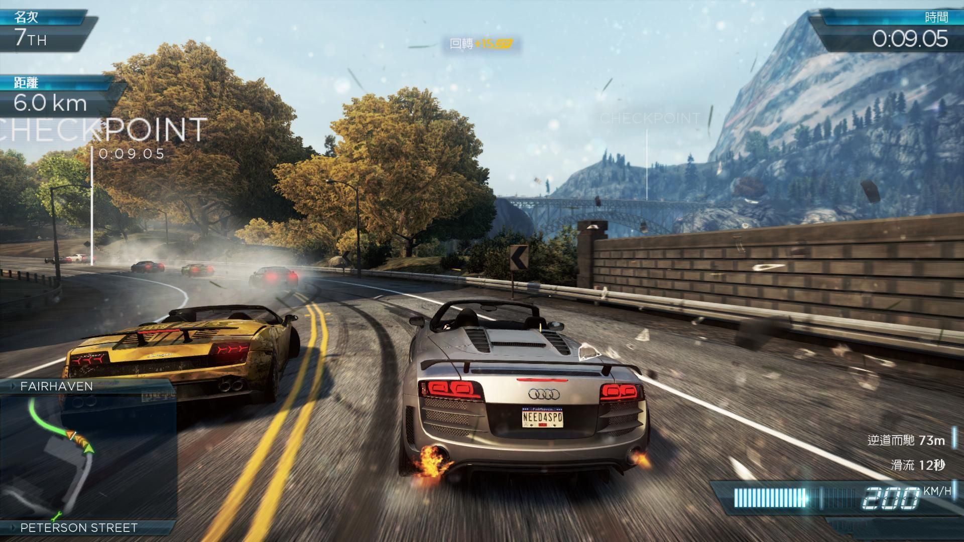 同樣是Criterion Games的一貫的傳統(tǒng),游戲中設(shè)計(jì)的撞車回放的功能,當(dāng)玩家的車輛撞擊到NPC車輛、警車、路障、墻壁、總之一切不該撞上的東西,游戲就會(huì)給這場(chǎng)車禍一個(gè)特寫,之后或放置玩家的車輛不管(在非比賽情況下),或重置玩家的車輛(比賽之中)。