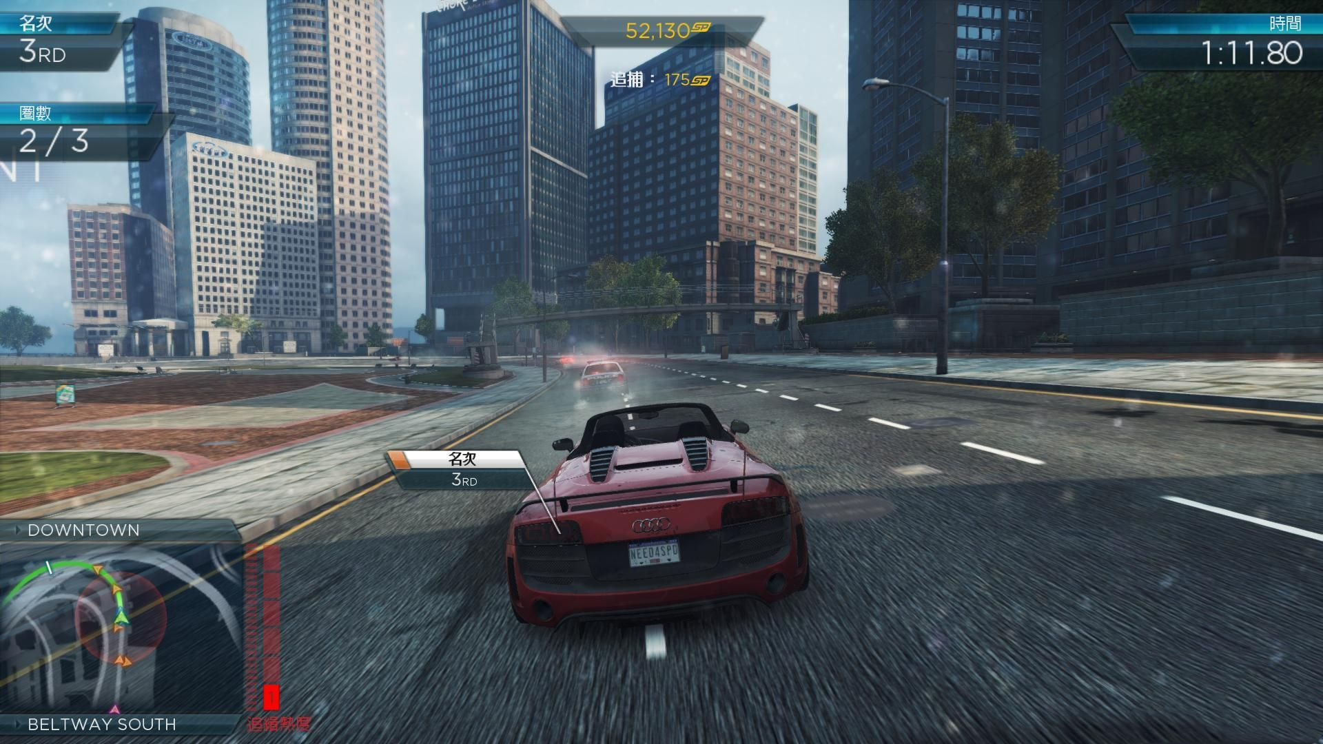 4、競(jìng)速賽:這個(gè)不多說(shuō)了,類似于極品飛車17超越賽,賽道不往復(fù)跑,從最后一名超越至第一名。所有比賽贏得名次后會(huì)有獎(jiǎng)勵(lì)SP和升級(jí)改裝,比賽后可按Rctrl快速升級(jí)。