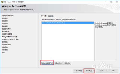 選擇混合模式,輸入sa的密碼,然后點擊添加當前用戶,添加用戶后點擊下一步