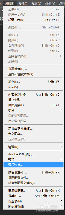 PS如何遠(yuǎn)程連接像素大廚PxCook?1.如圖,在打開ps后,打開編輯菜單,在底部有一個遠(yuǎn)程連接,點擊將其打開