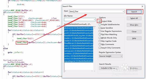 鼠標(biāo)點(diǎn)擊任意的函數(shù)名或變量,按Ctrl+Shift+F可以在整個(gè)工程內(nèi)搜索包含關(guān)鍵詞的文件以及位置。