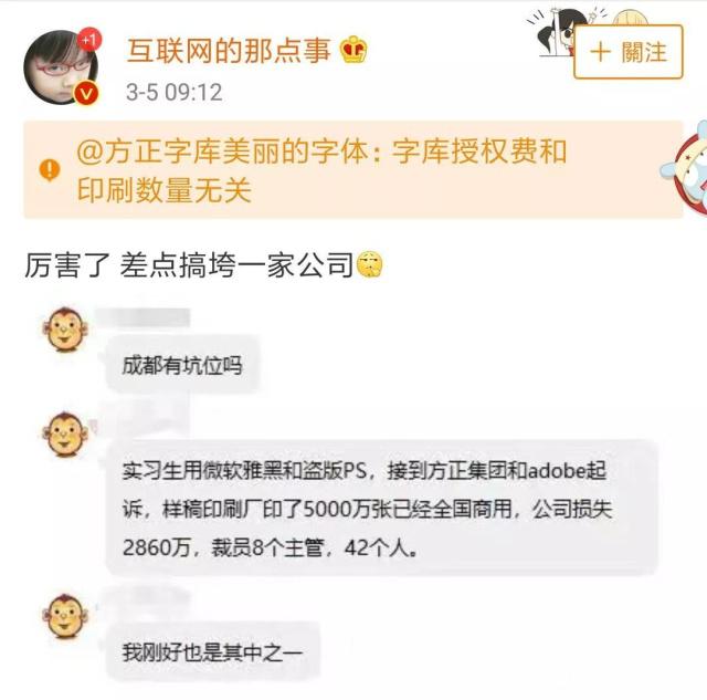 3月5日9點多,微博大V“互聯(lián)網(wǎng)的那點事”發(fā)布了一張截圖,稱有位實習(xí)生使用了“微軟雅黑”和盜版PS,接到方正集團和Adobe起訴,公司損失2860萬,多人被裁員。