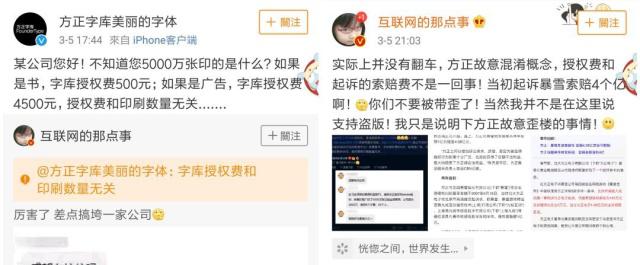 事情迅速傳播,不少人在評論區(qū)現(xiàn)身說法表示自己也曾經(jīng)踩過坑。至當(dāng)天下午五點多,方正官方微博“方正字庫美麗的字體”轉(zhuǎn)發(fā)并回應(yīng)稱,授權(quán)費和印刷數(shù)量無關(guān),疑似辟謠。但隨后“互聯(lián)網(wǎng)的那點事”表示方正故意混淆概念,授權(quán)費和起訴的索賠費不一樣。雙方battle的觀點都得到了不少網(wǎng)友的支持。